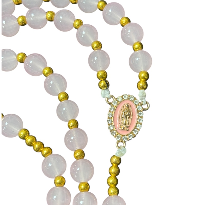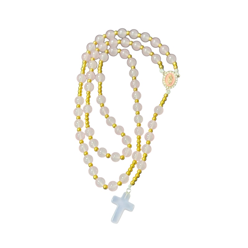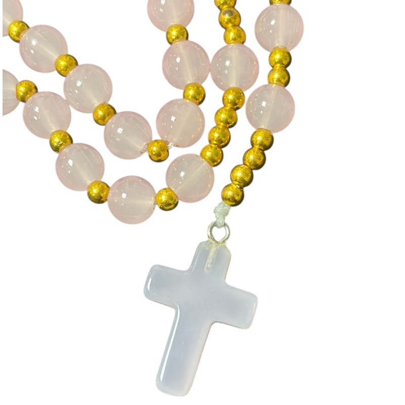 Chapelet en perles naturelles de quartz rose , croix en pierre ornementale